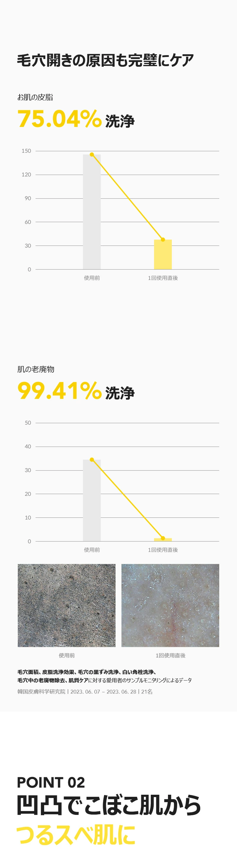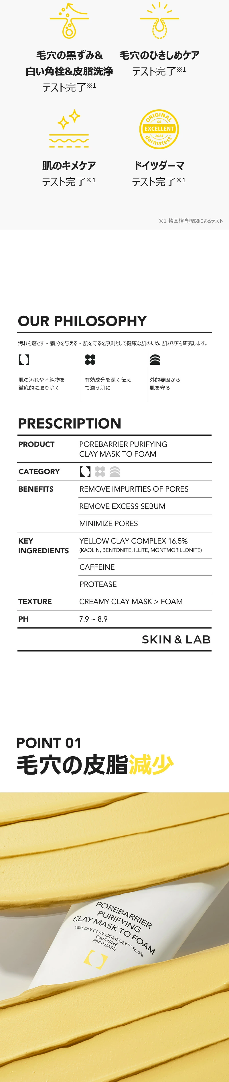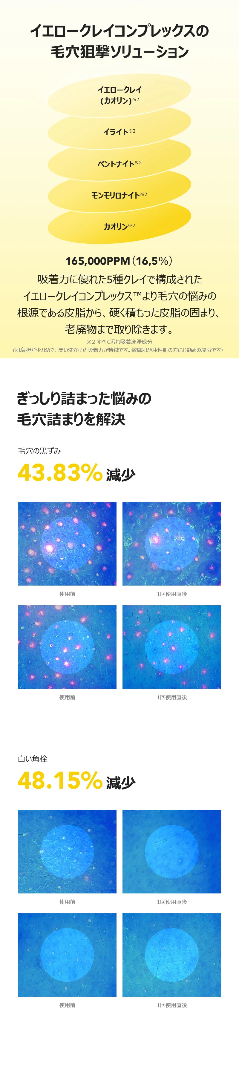 皮脂で詰まった毛穴一度に消して、毛穴の開きを締めて毛穴すっきりパック。吸着力に優れた5種クレイで構成されたイエロークレイコンプレックスより、毛穴の悩みの根源である皮脂から硬く積もった皮脂の固まり、老廃物まで取り除きます。