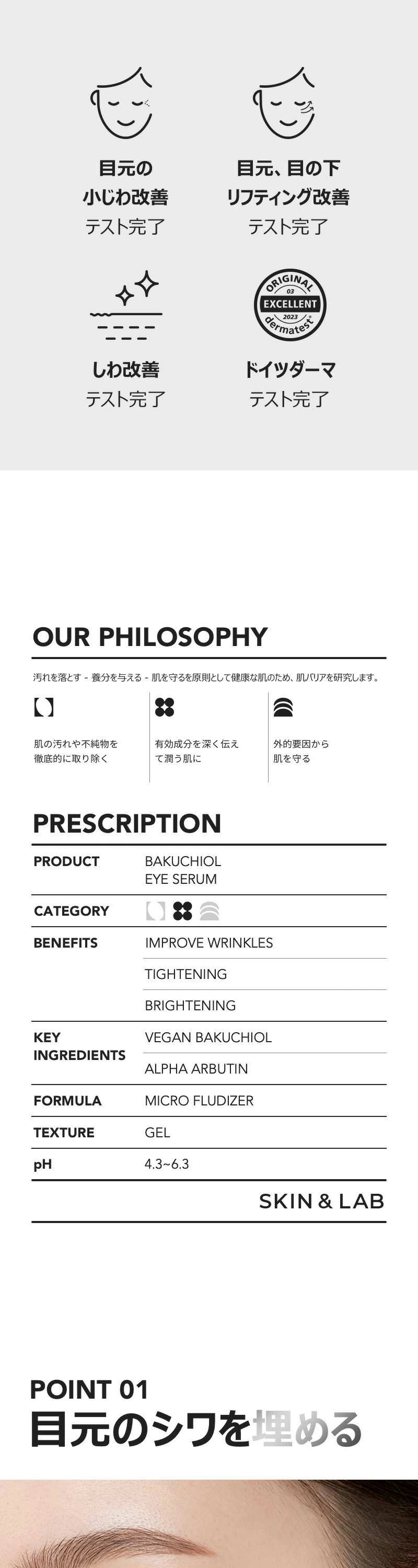 水分感あふれるジェルテクスチャーでしっとりさせ、刺激を与えないように目元をケアし、べたつきなく仕上がります。