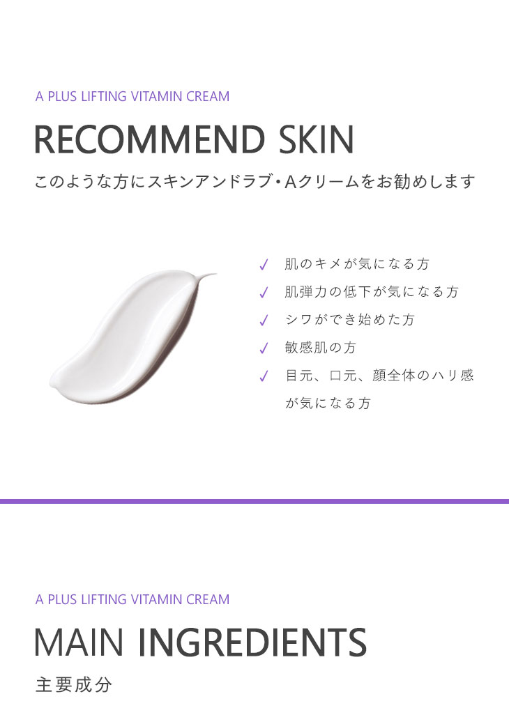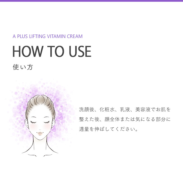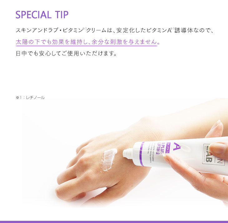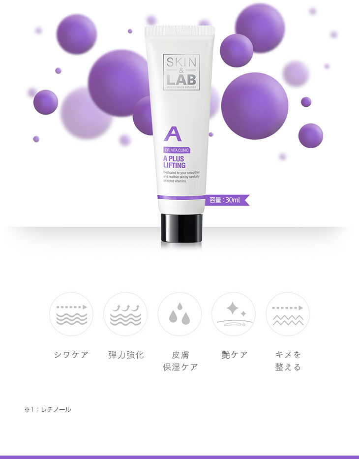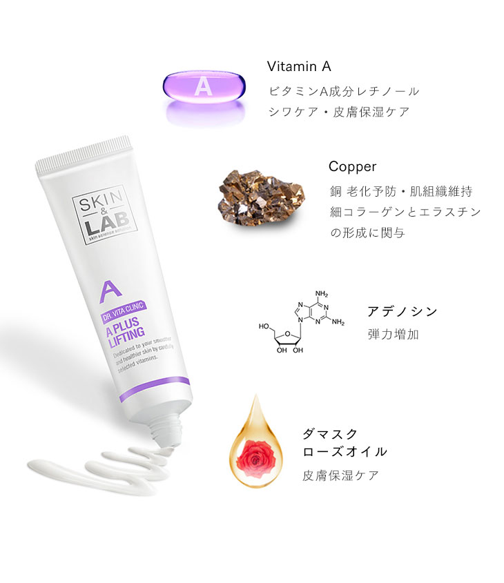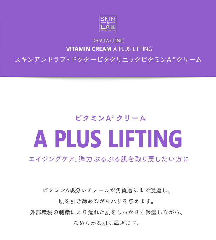 ビタミンA配合クリーム。アンチエイジング効果でシワ改善、弾力ぷるぷる肌を取り戻したい方に。ほうれい線改善、コラーゲン生成、弾力強化、老化予防に作用し、元気な若々しい肌へ。