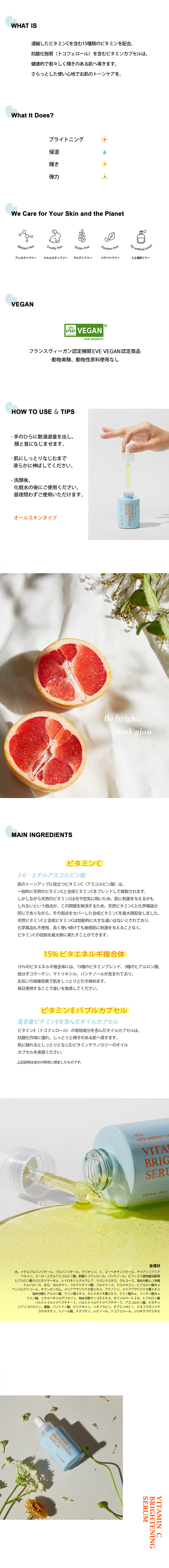 ビタミンCセラムは濃縮したビタミンCを含む15種類のビタミンを配合した美容液です。抗酸化物質(トコフェロール)を含むビタミンカプセルは、健康的で若々しく輝きのある肌へ導きます。さらっとした使い心地でお肌のトーンケアを。